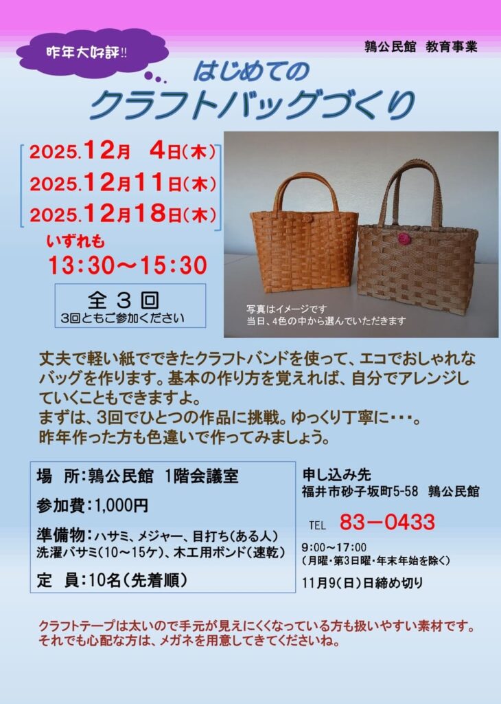 2025年10月15日 / 最終更新日時 : 2025年10月1日 鶉公民館福井市 健康長寿事業 はじめてのクラフトバッグ作り昨年好評だったクラフトバッグ作りを今年度もやります!関心がある方はぜひ参加してくださいね♪詳細はチラシをご覧ください。Follow me!FacebookXBlueskyHatenaCopyコメントを残す コメントをキャンセルメールアドレスが公開されることはありません。 ※ が付いている欄は必須項目ですコメント ※名前 ※ メール ※ サイト 数字で答えを入力してください:three × five =